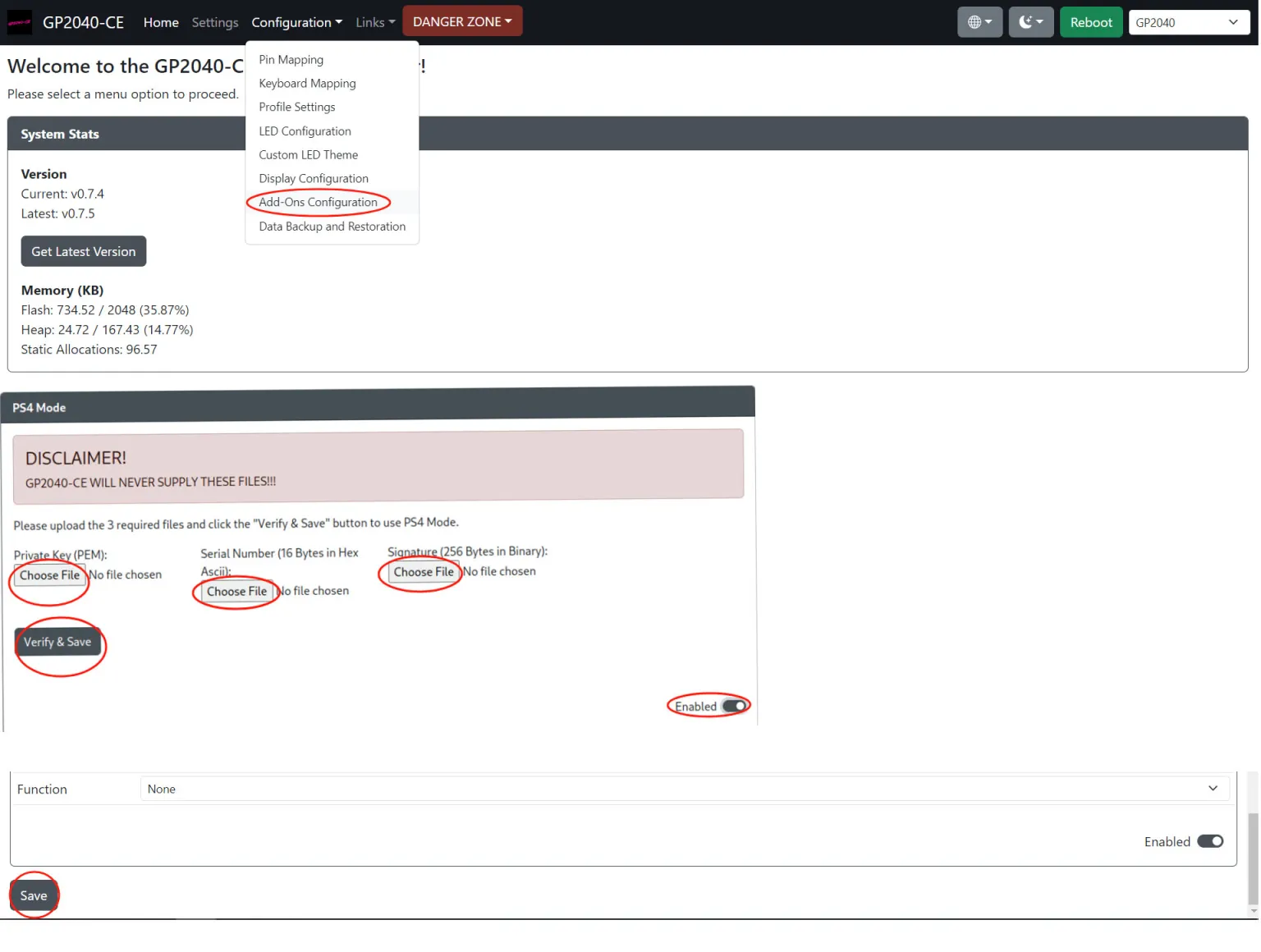 3,PS4モードを見つけて有効にし、必要な3つのファイルをアップロードして[検証して保存]をクリックします。