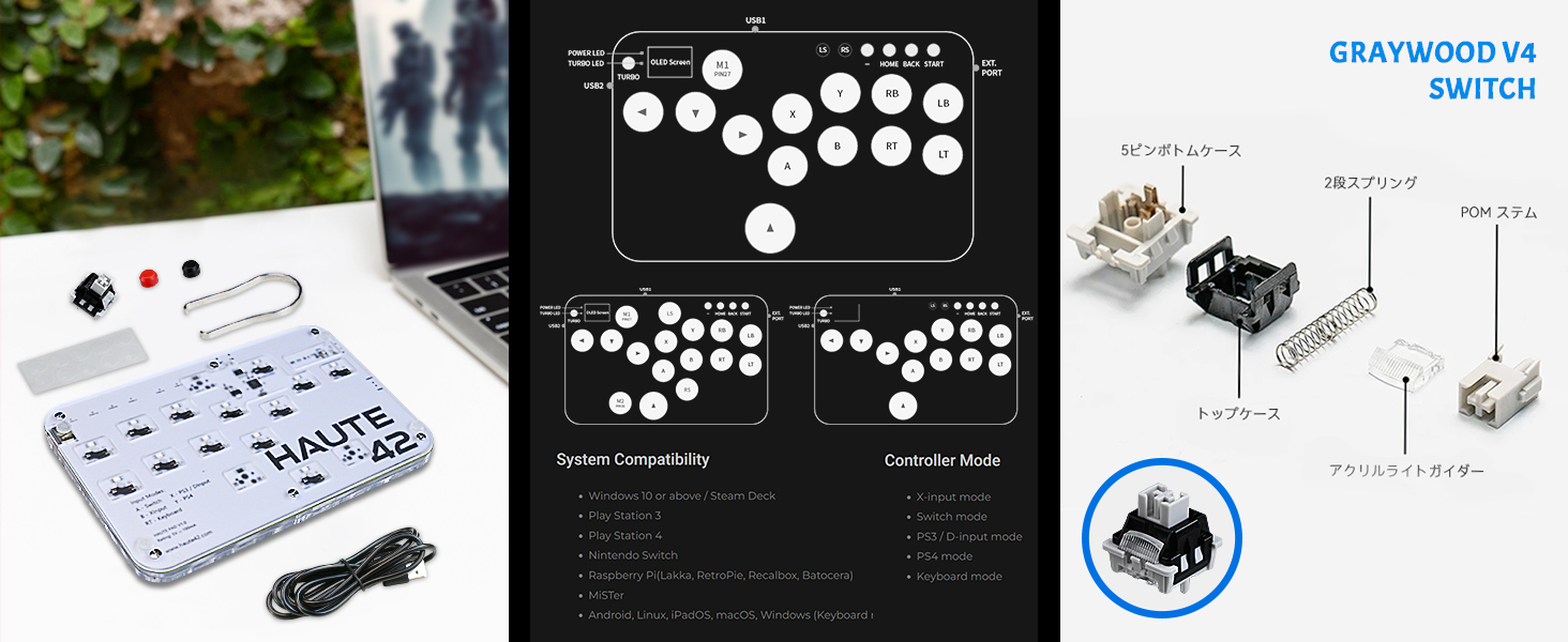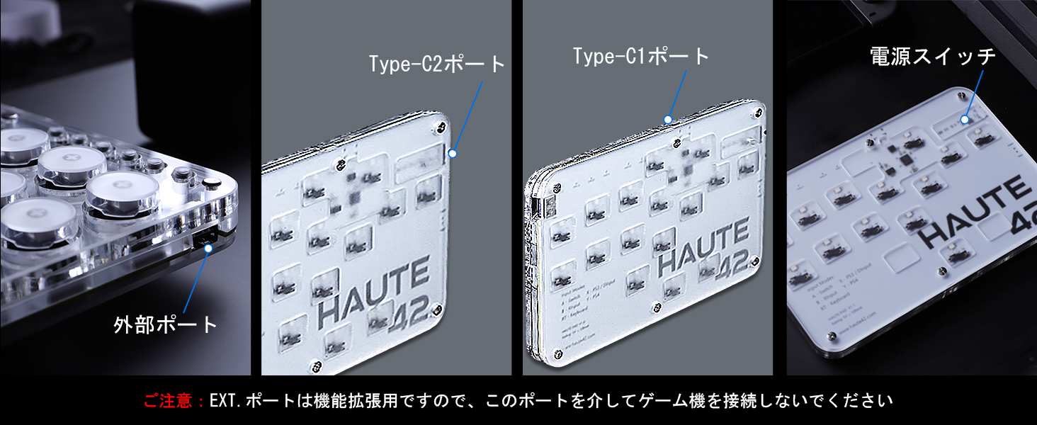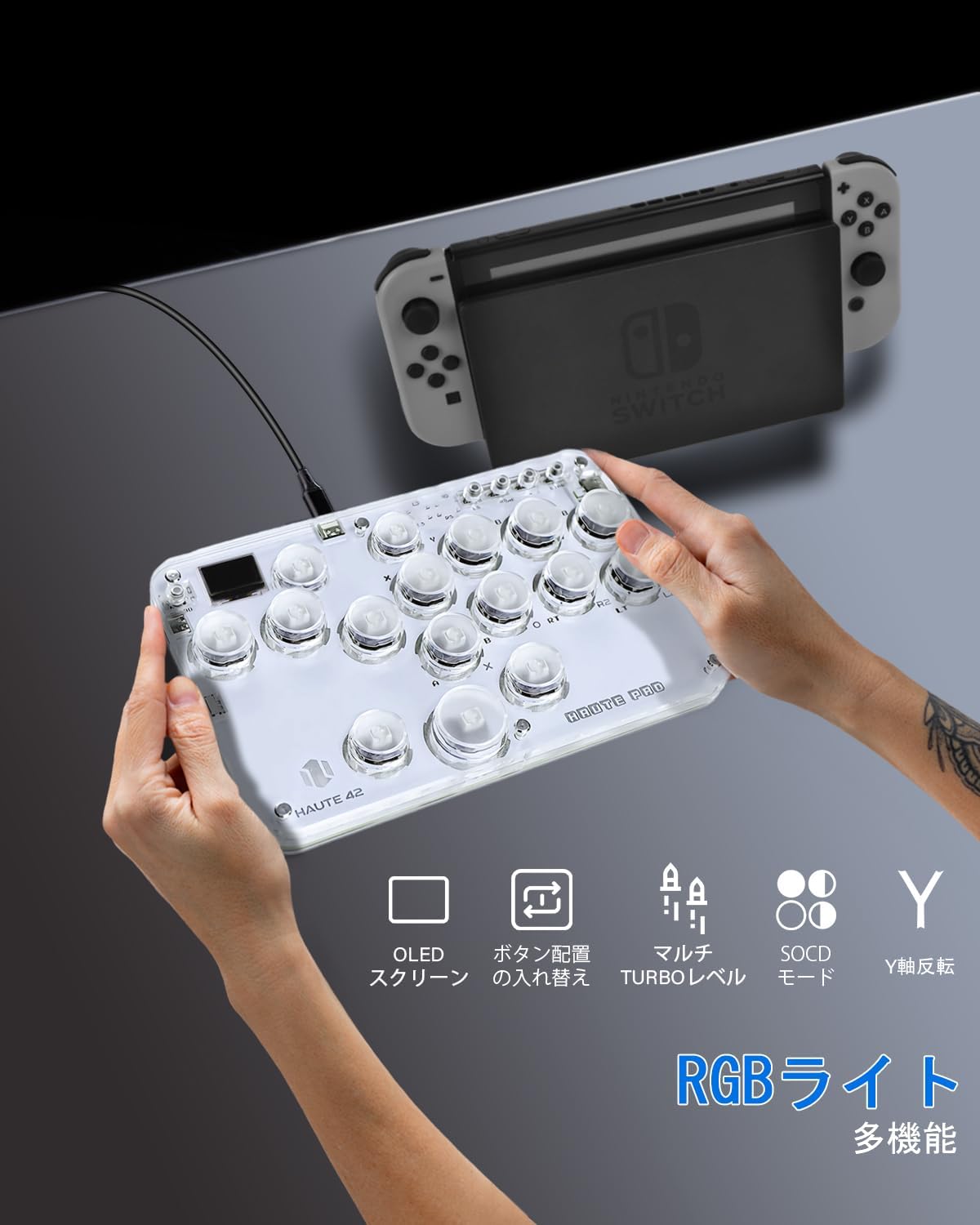2、【ご注意&超低1ms遅延】 For PS4/PS5本体の接続については、公式サイトまたはマニュアルを参照して設定する必要がありますので、必ず日本語取扱説明書または公式サイトのリンク先(haute42.com/supports/)をよくお読みください。本製品はPS5本体でPS4ゲームをサポートしていますが、もしPS5ゲームを遊びたいなら、アケコン専用なコンバーターが要りますから、別途ご購入ください。M1とM2は同様の機能を持つ仕様、192.168.7.1のWebプラウザで、キー機能を変更出来ます。