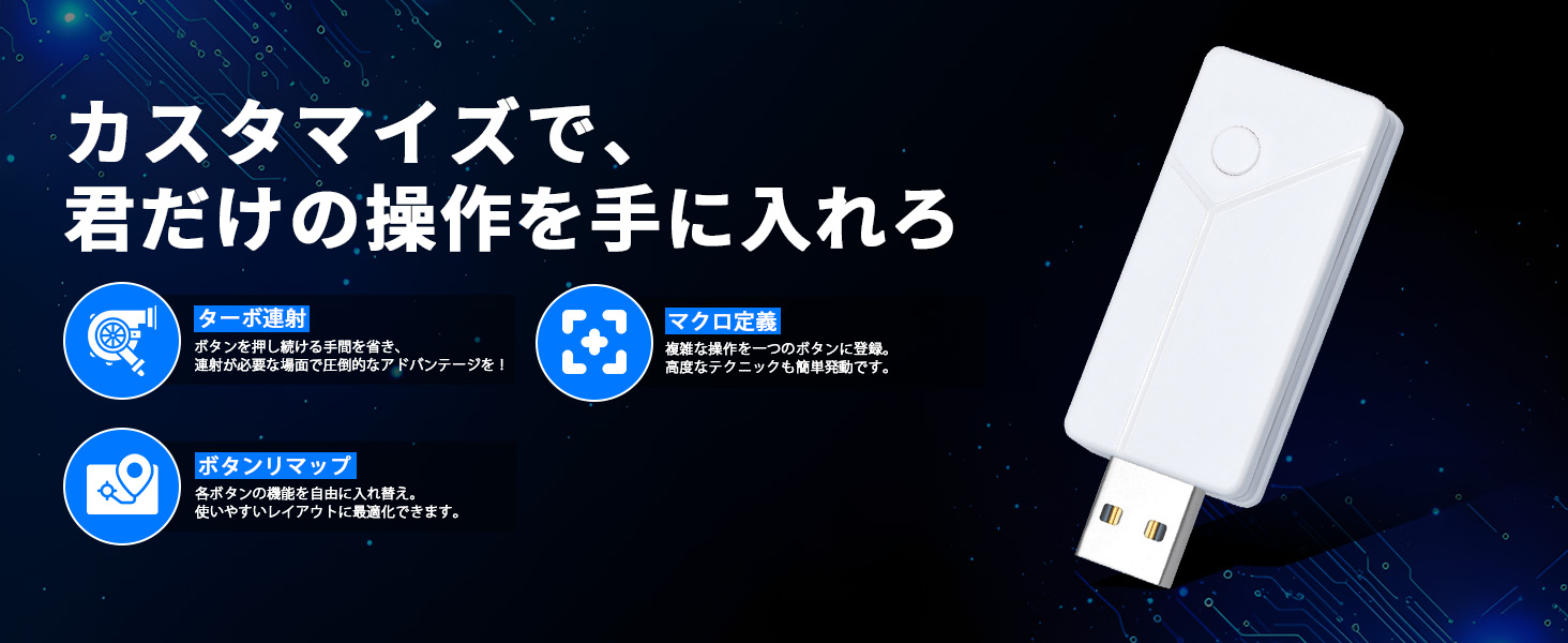 3、「追加機能搭載 ゲームプレイを最適化」 ソフトウェア(別途対応)を使用することで、Turbo(連射)、Remap(キー再割り当て)、Macro(マクロ)機能を追加できます。アクションゲームやシューティングゲームなど、様々なジャンルのゲームで操作を効率化し、戦闘力をアップさせます。