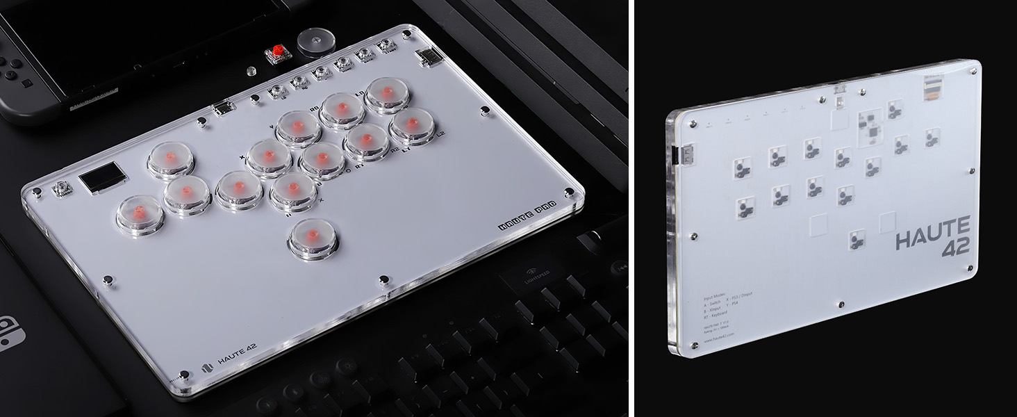 2、【ご注意&超低1ms遅延】 For PS4/PS5本体の接続については、公式サイトまたはマニュアルを参照して設定する必要がありますので、必ず日本語取扱説明書または公式サイトのリンク先(haute42.com/supports/)をよくお読みください。基盤/システムは低遅延のRaspberry pi pico GP2040-CEを搭載しており、静音性に優れボタンの高さを抑えた「Kailh Choc V2」の赤軸を使用しています。
