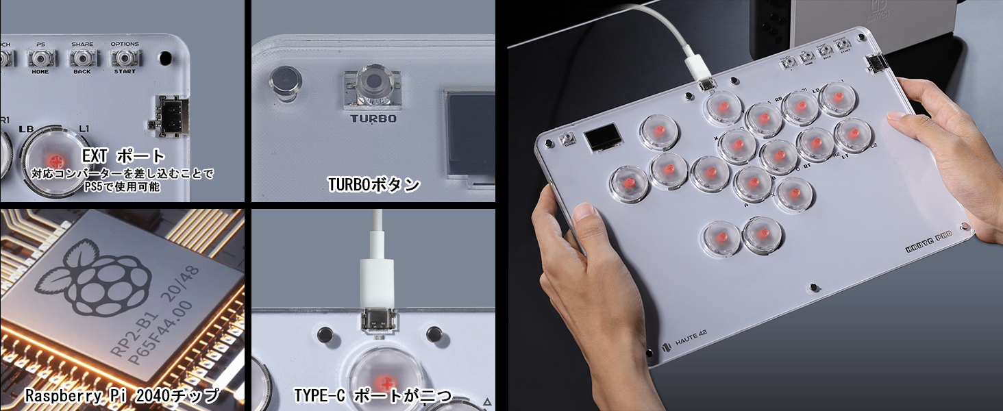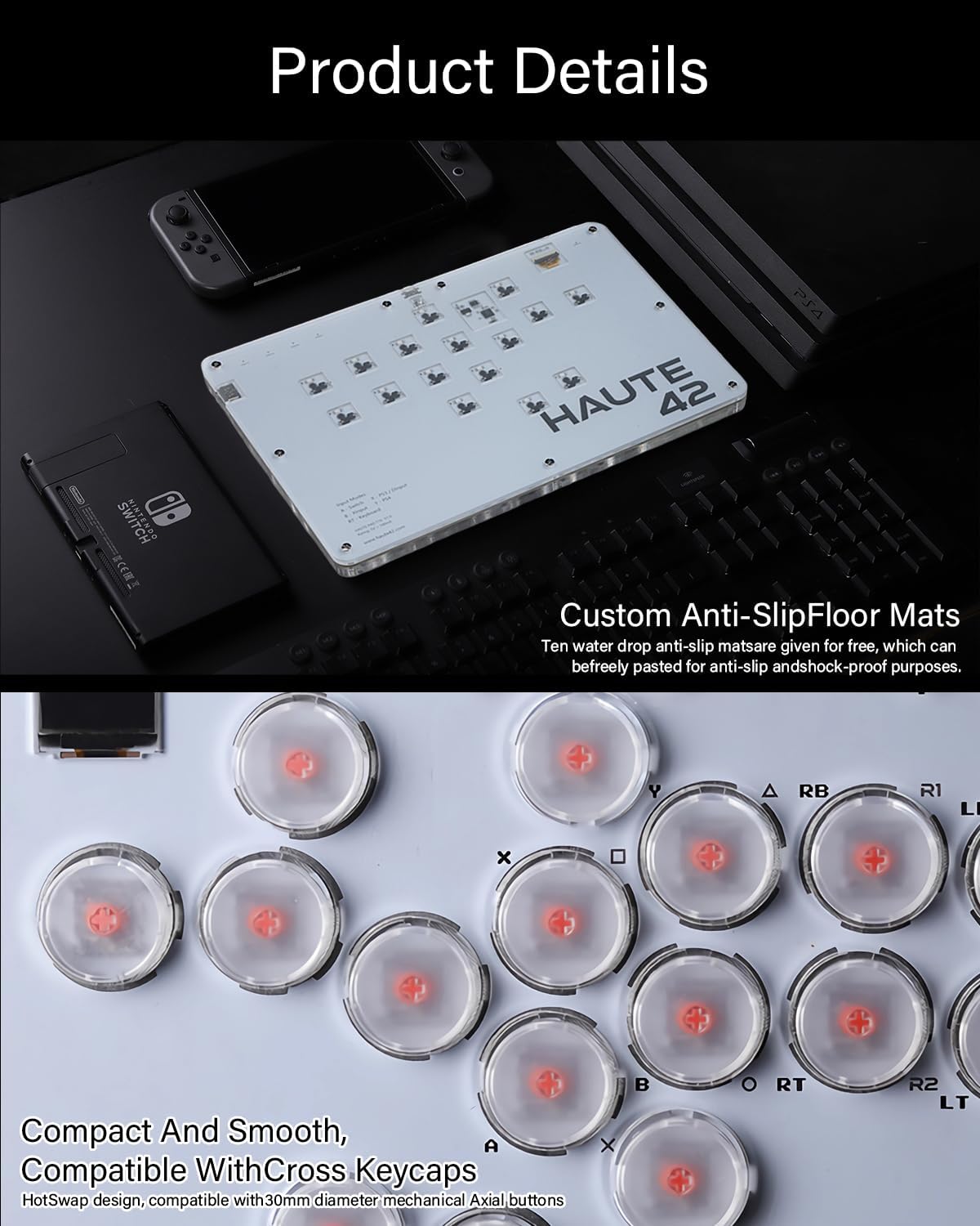 2、【ご注意&超低1ms遅延】 For PS4/PS5本体の接続については、公式サイトまたはマニュアルを参照して設定する必要がありますので、必ず日本語取扱説明書または公式サイトのリンク先(haute42.com/supports/)をよくお読みください。本製品はPS5本体でPS4ゲームをサポートしていますが、もしPS5ゲームを遊びたいなら、アケコン専用なコンバーターが要りますから、別途で、ご購入していただけます。ボタンはホットスワップ対応、本体の開閉が不要で、易くスイッチやキーキャップをカスタマイズ可能なので、スイッチの摩耗を気にしなくていいです。もし、キーキャップがいきなり取れる、自然磨耗の場合は弊店までご連絡下さい、キーキャップの交換を無料で手配させていただきます。