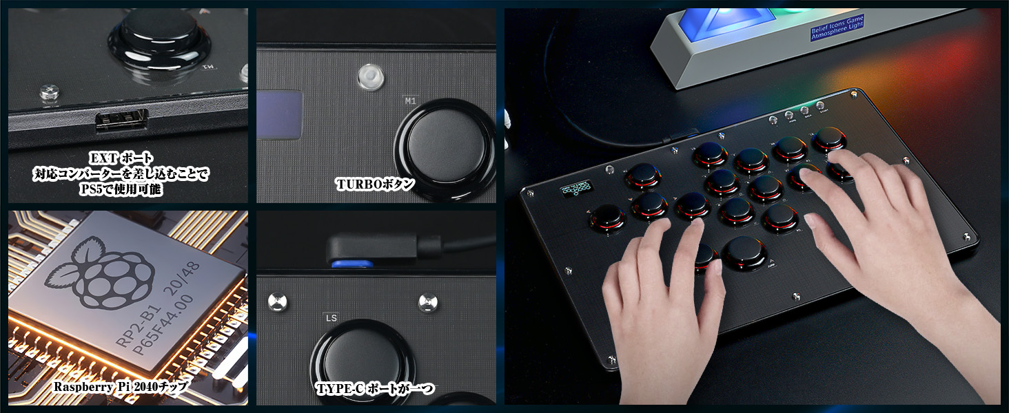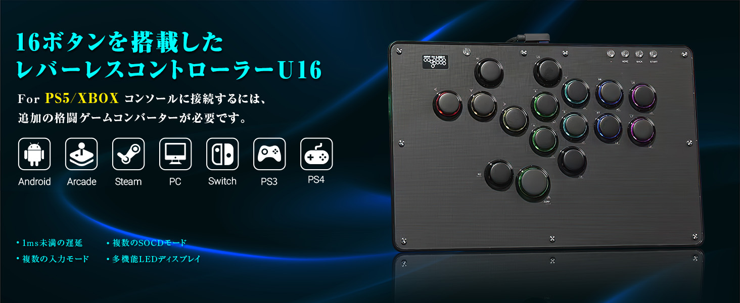 1.【格ゲー向けのレバーレスアケコンU16黒】 他社と比べれば、ボタン枠の追加で安定感が向上し、操作性が格段に上がった。全体的にボタンの感触や打音がとても良好でありながらボタンが引っかかるや外れることなく、ちょうど良いサイズで運指がスムーズ。さらに、ボタン内部のRGBライトが七色に光り、発色はカスタマイズ可能。レバーよりも入力スピードが向上し、コマンド技を素早く出せるため、戦闘力も格段にアップ!システムが pico GP2040-CE、不具合修正などのファームウェア更新が可能。対応機種:Windows 10以降/ Steam Deck/PS3/PS4/Switch/Raspberry Pi(Lakka、RetroPie、Recalbox、Batocera)/MiSTer/Android、Linux、iPadOS、macOS. PS5やXBOXに接続する際は、専用の格ゲーコンバーターが必要です。互換性を確保するために、ぜひ別途ご購入ください。弊社では、PS4/PS5に対応したBooter5コンバーターと、XBOX用のBrook Wingman FGCを取り扱っています。