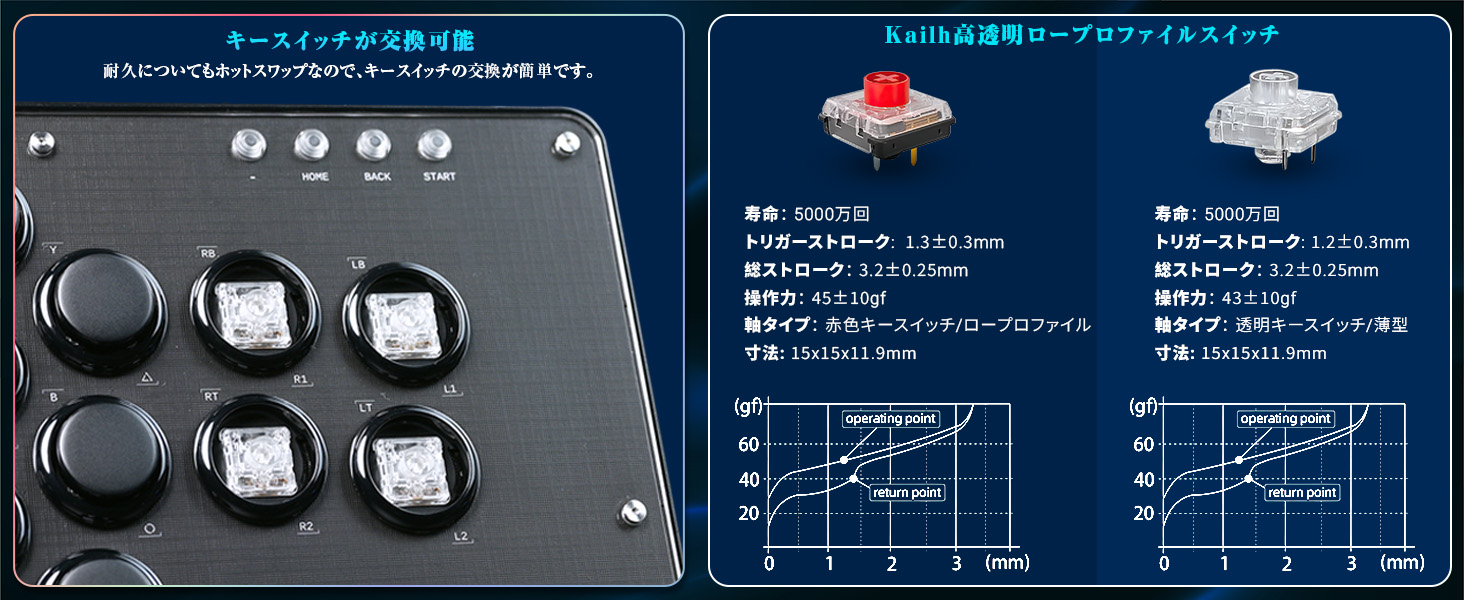 3、【For PS4/PS5に接続ご注意】 PS4/PS5本体に接続する際は、公式サイト(haute42.com/supports/)またはマニュアルを参照し、設定を行ってください。PS5やXBOXに接続する際は、専用の格ゲーコンバーターが必要です。互換性を確保するために、ぜひ別途ご購入ください。弊社では、PS4/PS5に対応したBooter5コンバーターと、XBOX用のBrook Wingman FGCを取り扱っています。カスタムキーM1とM2ボタンで同様の機能を持つ仕様、192.168.7.1のブラウザからキー機能を変更できます。耐久についてもホットスワップ対応で、キースイッチの交換が簡単です。