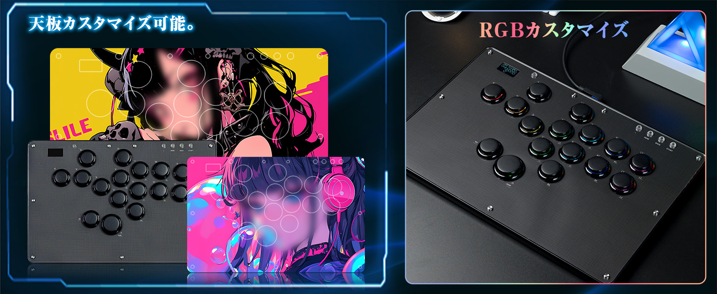 2、【個性的な利点】 他機種と比べ、今回のU16にはイラスト2枚、DIY用紙2枚が付属しており、DIY用紙に落書きして自分だけのレバーレスコントローラーを作成できます。また、U16はPC製なので、より軽くて薄型デザインでカバンに入れる時も嵩張らず持ち運びが便利。レトロなアーケード風のボタン枠とRGB照明効果が備えていて、初心者からプロゲーマーまで幅広くお勧めできるレバーレス アケコンです。