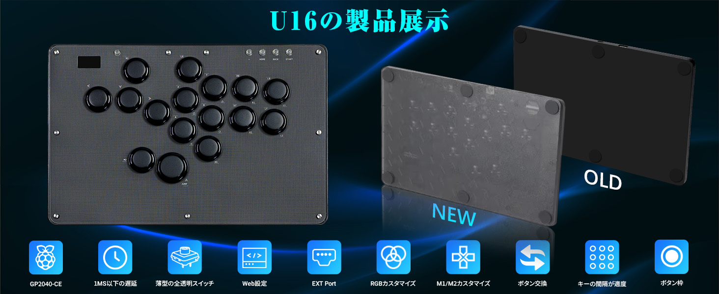 4.【圧倒的な機能】 U16は他のレバーレスには無い機能が盛りだくさんです。・連射機能あり。・アナログスティックの変更。・SOCD選択機能付き。・キーボード操作の割り当てが可能。・プロファイルを4つまで保存できて使用中にワンボタンで変更可能。・LEDで光る、パターン選択可能。・キースイッチ交換。・EXT ポートとカスタムキーM1/M2。・方向キーを同時押しした際の細かい設定。・ボタンのマッピング機能なども有り、機能面では優れています。例えばSOCDクリーナーを変えたりオフにしたり、いっそゲームコントローラーではなくキーボードとして認識させるなんてこともGP2040-CEなら出来ます。