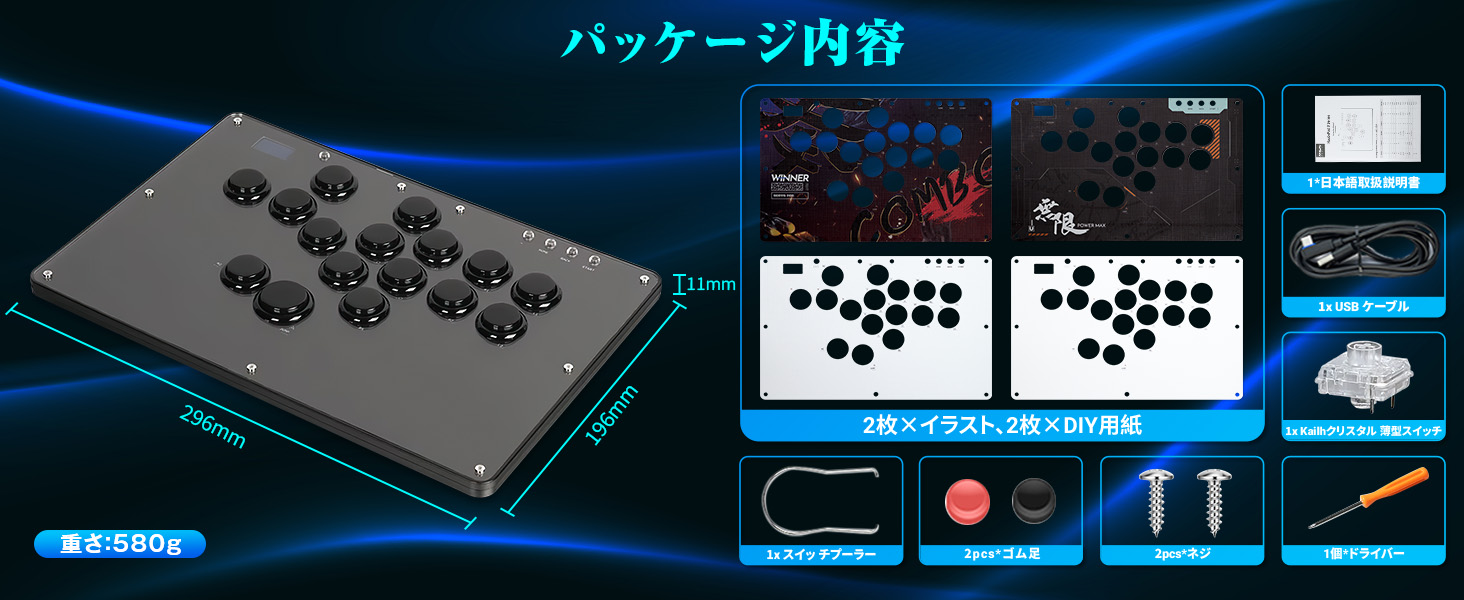 5.【パッケージ内容】 製品サイズ 296*196*11mm、重さ 580g。膝置きプレイにも使いやすいサイズ!U16黒 格闘ゲームコントローラー(16個ボタン)×1、DIY用紙×2枚、イラスト×2枚、USB-C ケーブルX1、スイッチプーラーX1、ゴム足×2、キースイッチ×1、ドライバー×1、ネジ×2、日本語取扱説明書X1。